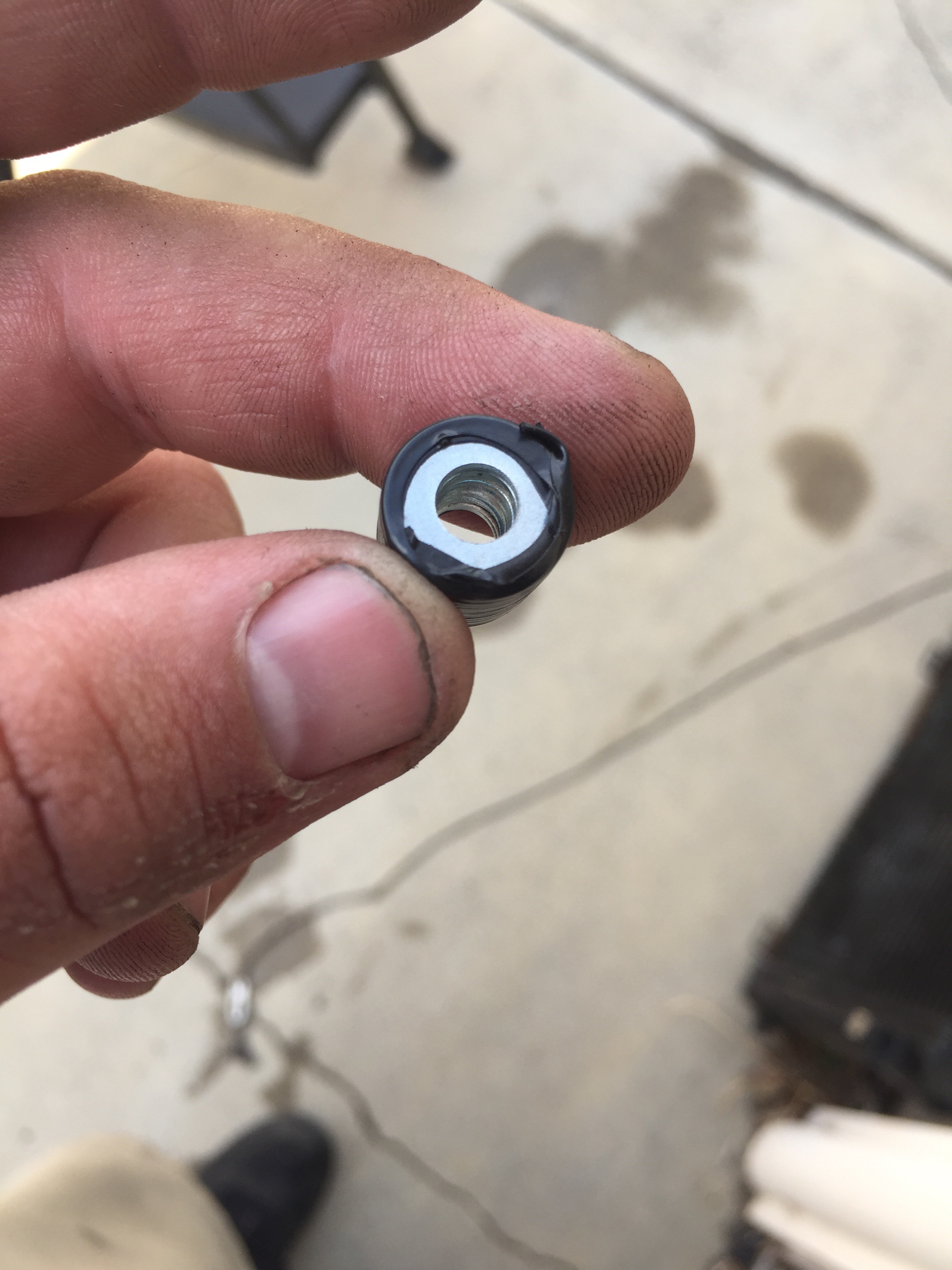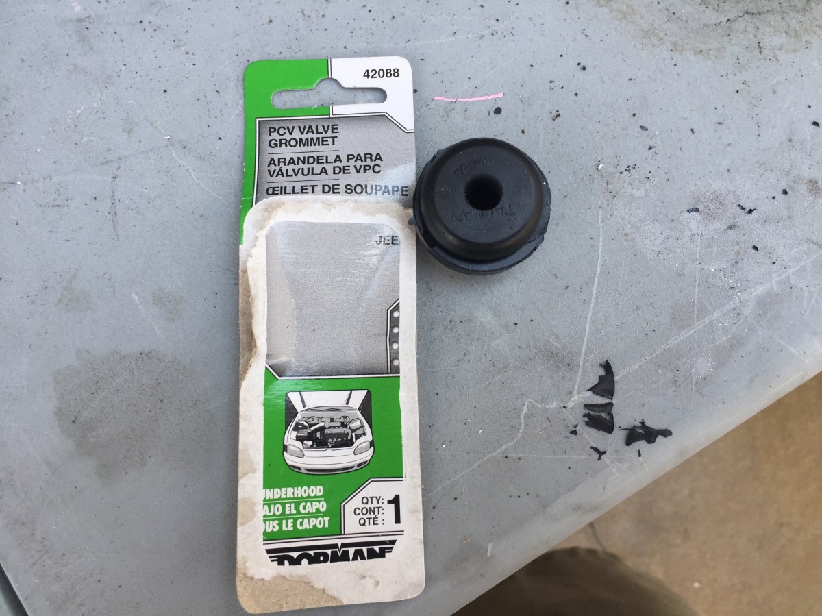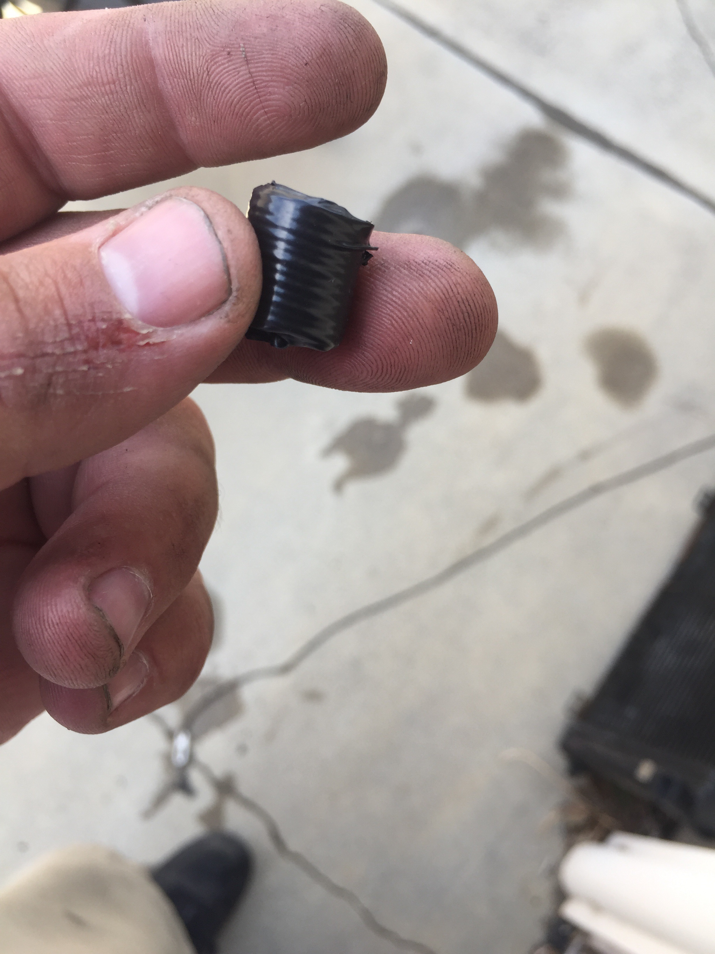 Again I’m not a fan of hacking things out that can easily be fix at minimal cost. Now I could have gone to the junk yard and ripped a radiator out of a junket just to get the bushings out of one of them but like I said, it was 109° outside and I didn’t feel like tearing another radiator out again for such a simple part I could fab up myself. So off to the air conditioned auto parts store. I grabbed two PVC grommets, cut the smaller upper section off with a razor knife. Drilled the hole out with a 1/2″ drill bit and voila, a nice, new, cheap grommet that I didn’t get by tearing another radiator apart.