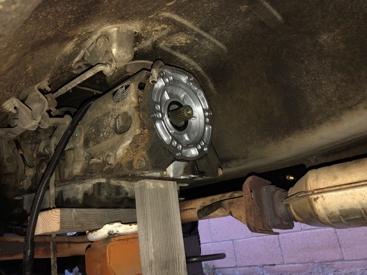 With the speedometer gear removed, I could remove the tail housing from the case. I removed the rear output shaft cover first. There were three bolts holding it on. After removing them, I discarded the bolts and the cover.