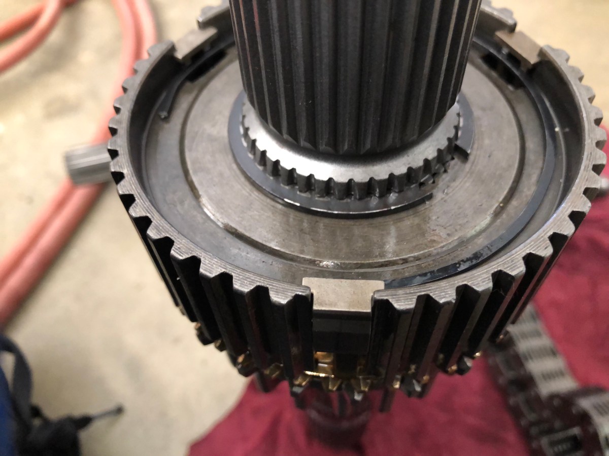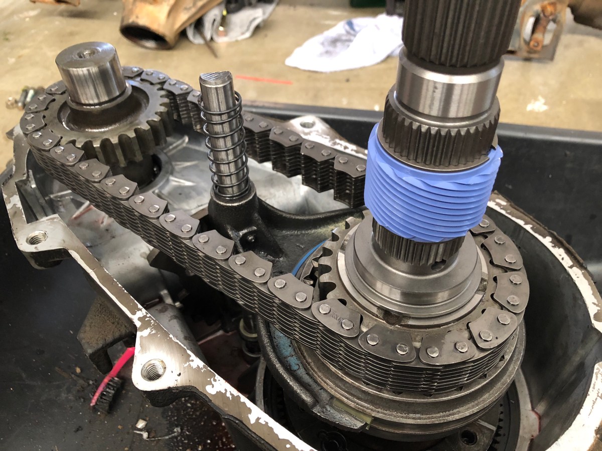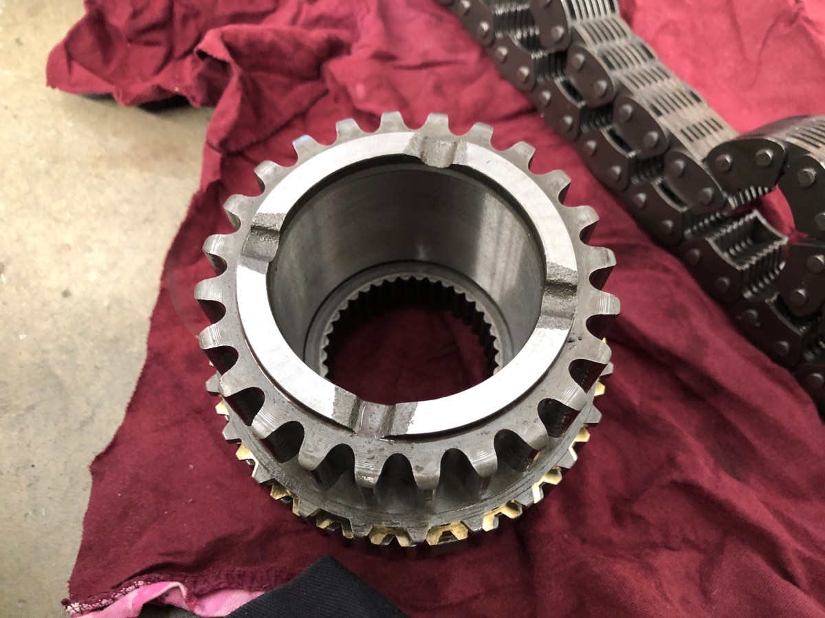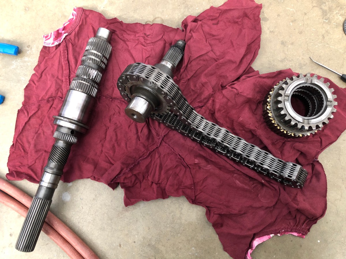 With the case split, I lifted the rear shaft and front shaft out of the case. It took some jiggling but it eventually lifted out, chain and all. I had to remove the mode hub assembly from the old shaft. There is a snap ring in the back of the output shaft that needed to be removed. Once removed, the mode hub slid off the old shaft.