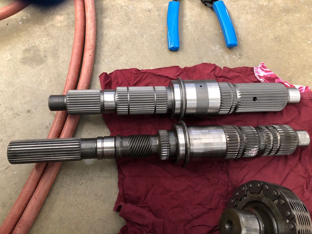 On older output shaft, the mode hub has two sets of needle bearings that needed to be removed. I used the new shaft to press out the needle bearings from the mode hub. Here is also a picture of the old shaft and new shaft side by side.