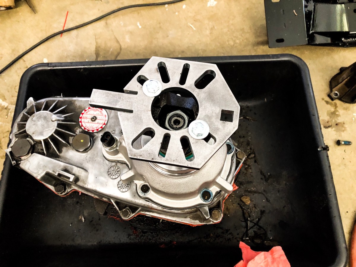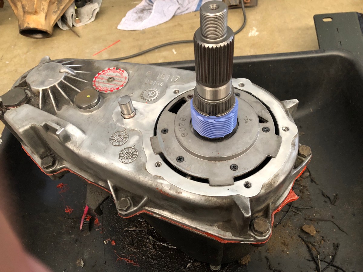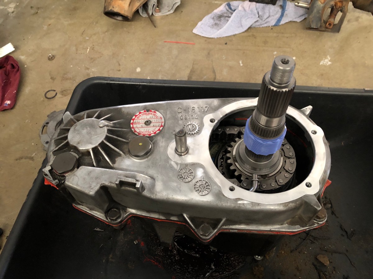 With the case out, I jacked the transmission back up and supported it with a 2×4.