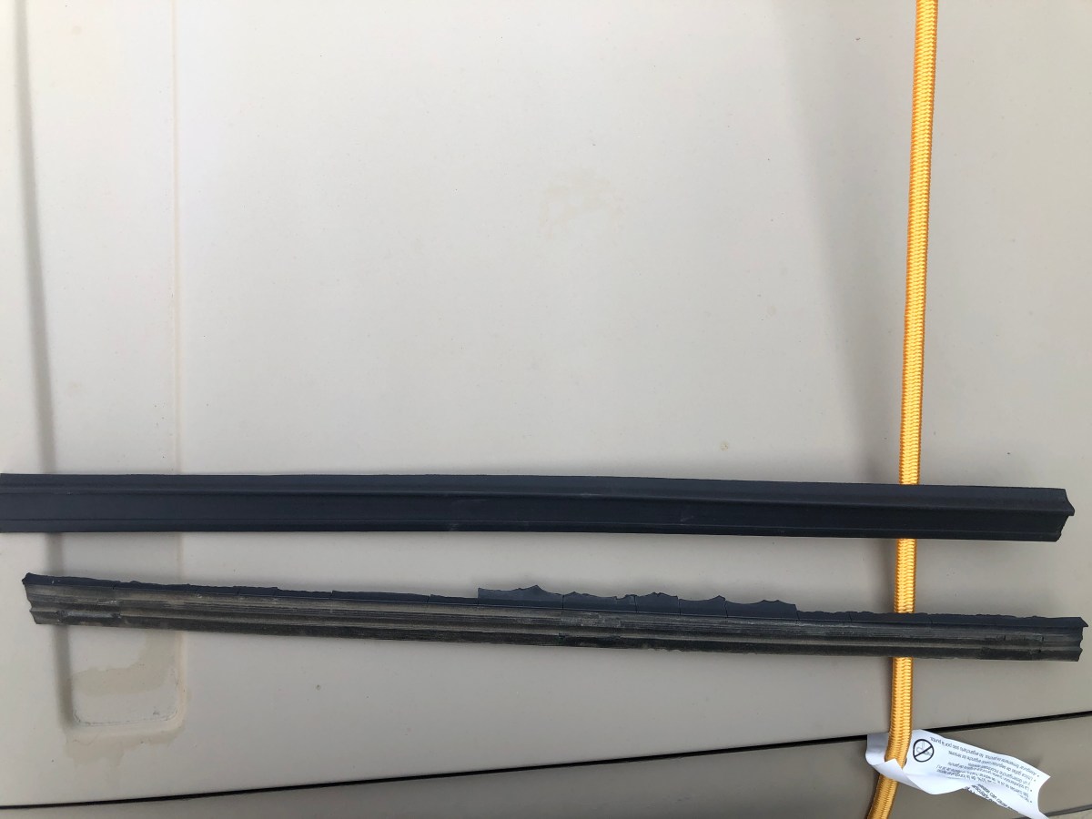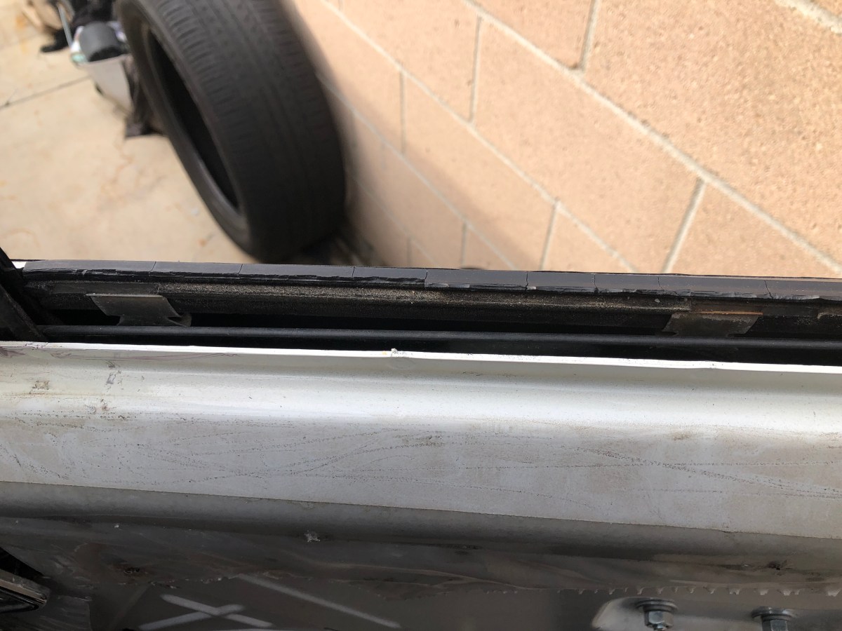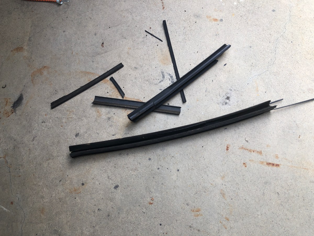 With the new outer seal installed in the trim clips, I set the assembly aside to be reinstalled later. The next piece I removed was the divider glass run. This glass run was completely worn out and brittle. Removing it was pretty simple. Each time I grabbed a piece of it to remove from the divider channel, the piece would break into multiple pieces. I continued doing this until the entire glass run was removed from the channel.